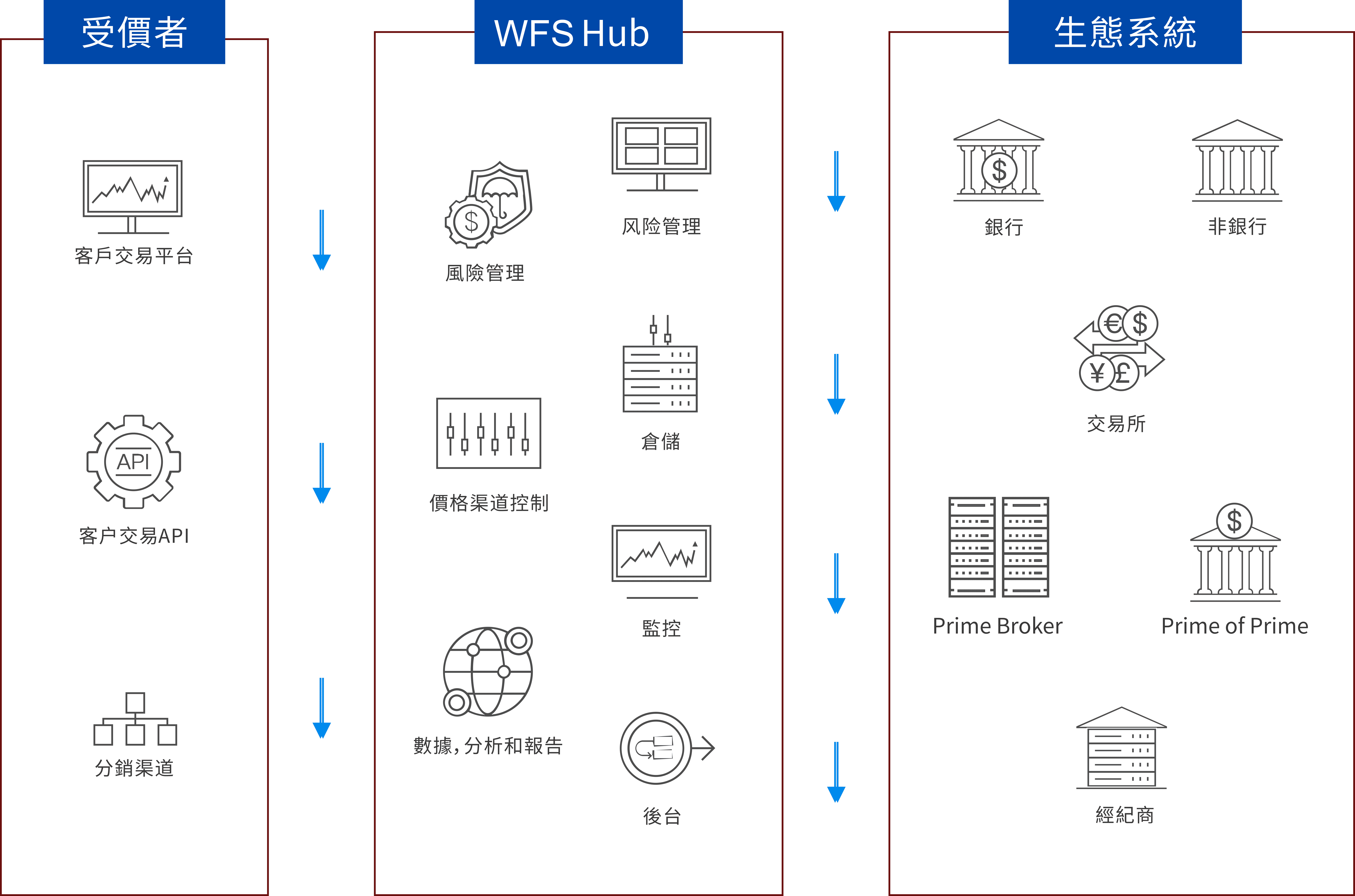 WFS通過fix(金融資訊交換協定)將接入的銀行間報價進行聚合,為客戶提供一級流動性場所的直接市場准入,通過專用物理HUB硬體聚合後的報價具有更低的點差和永續交易的深度