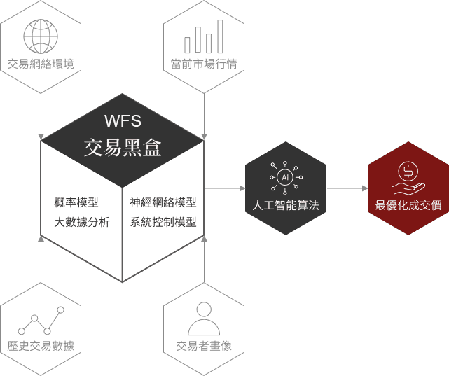 WFS交易黑盒,基於數千萬次的歷史交易數據、交易者的交易習慣、用戶内容等畫像、當前的市場行情和交易網路環境等,使用大數據統計分析、概率模型、神經網路模型、系統控制理論模型和人工智慧算灋等進行綜合研判,最終匹配更適合每位交易者内容的LP,達成最優的成交價格